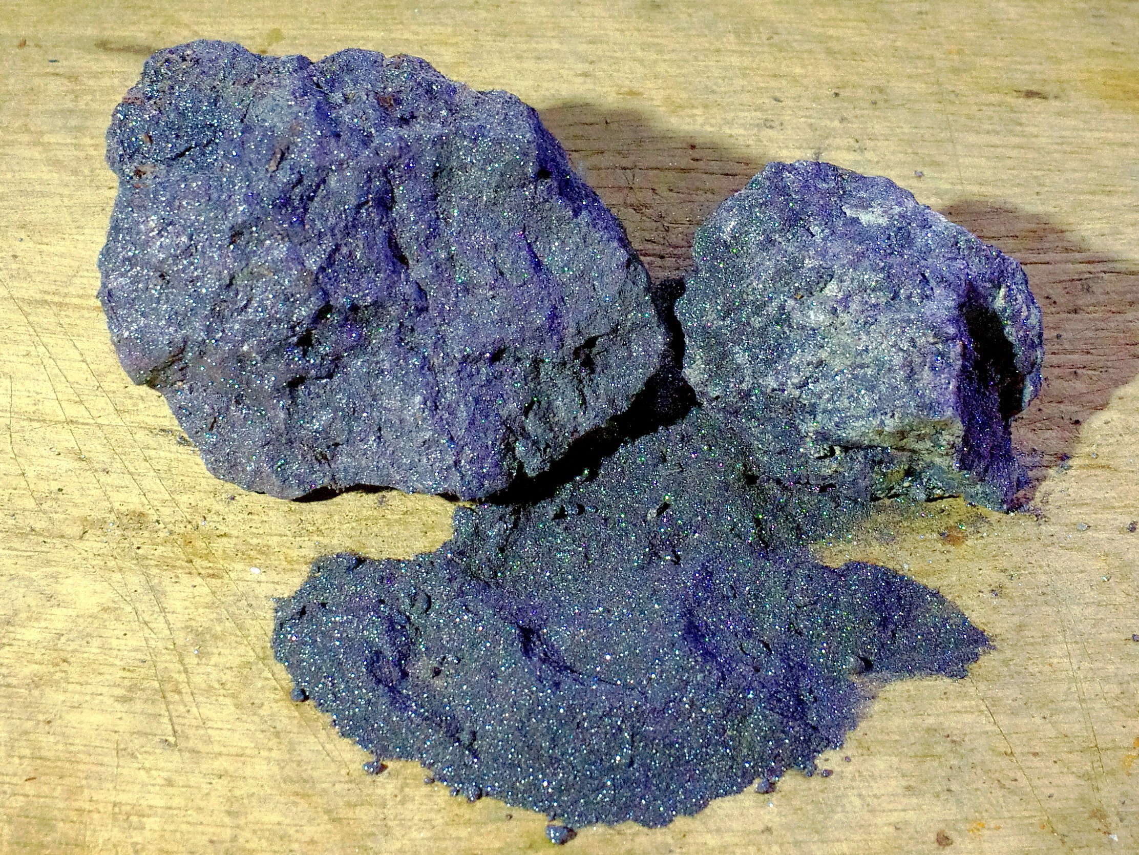 Finished MIO feels soapy to the touch and flows almost like water. Although they are easily washed off with water, the particles are almost impossible to get completely off clothing, so a shiny ore miner could (can) always be recognised by the residual glitter under artificial light or sunlight.