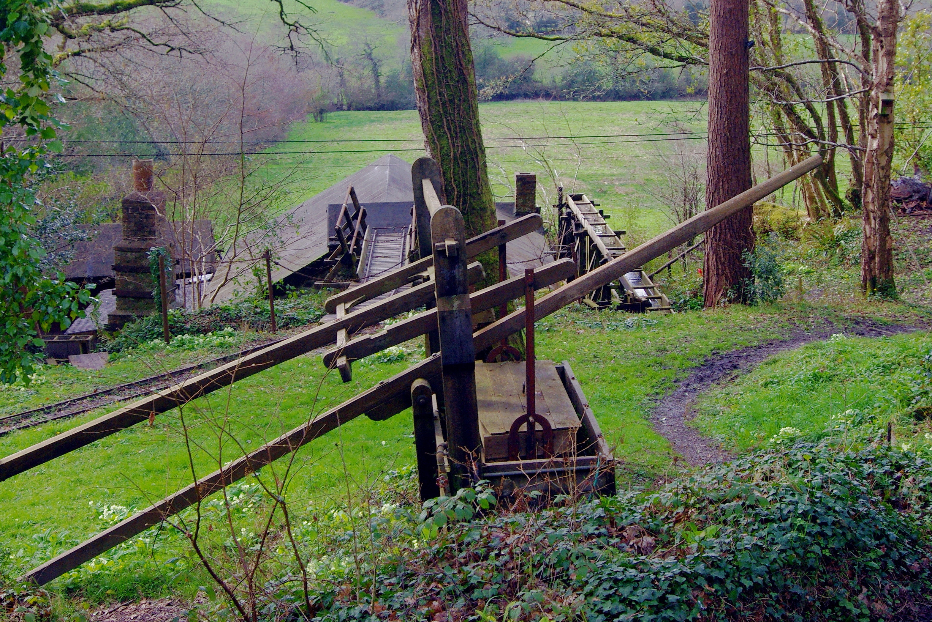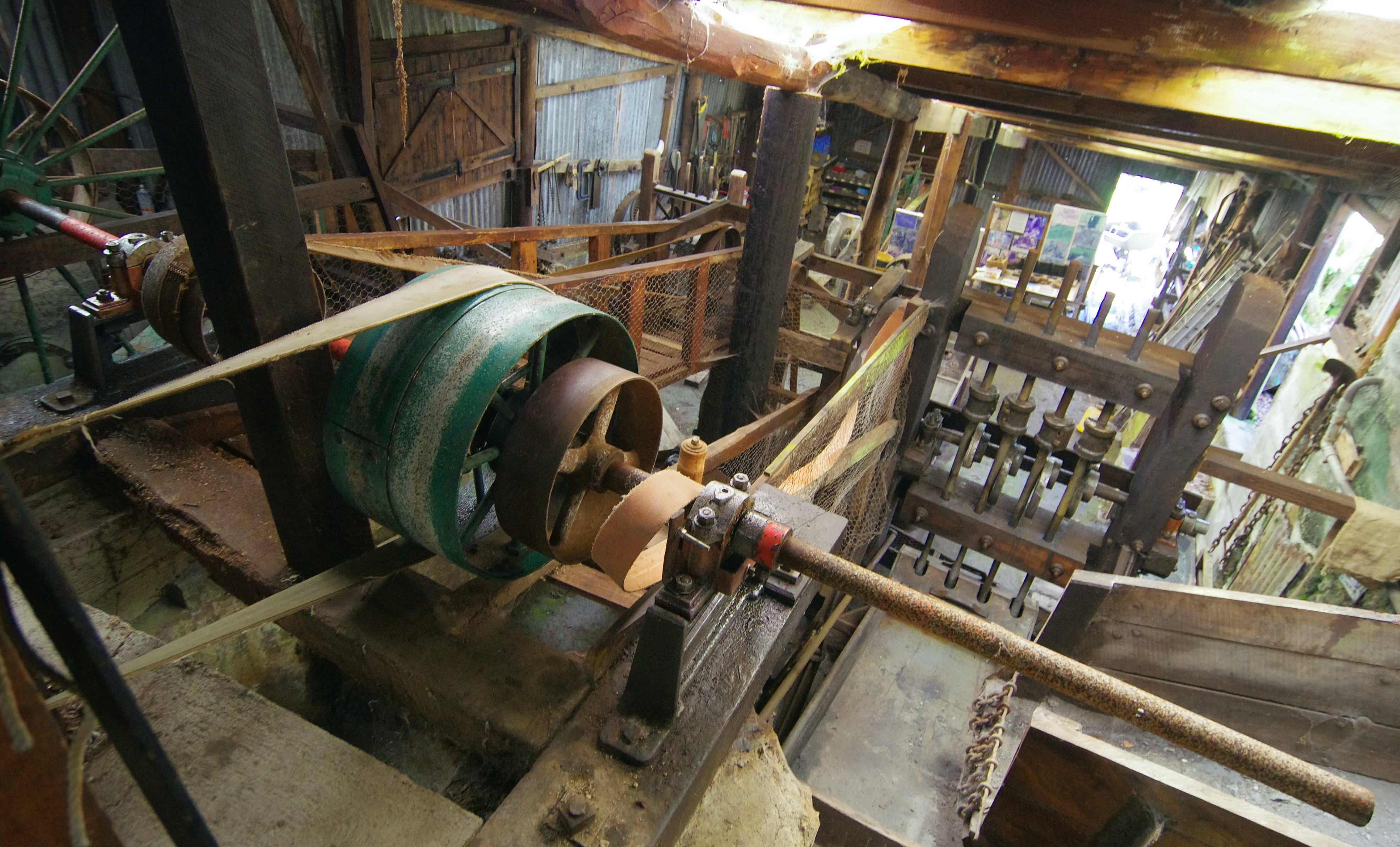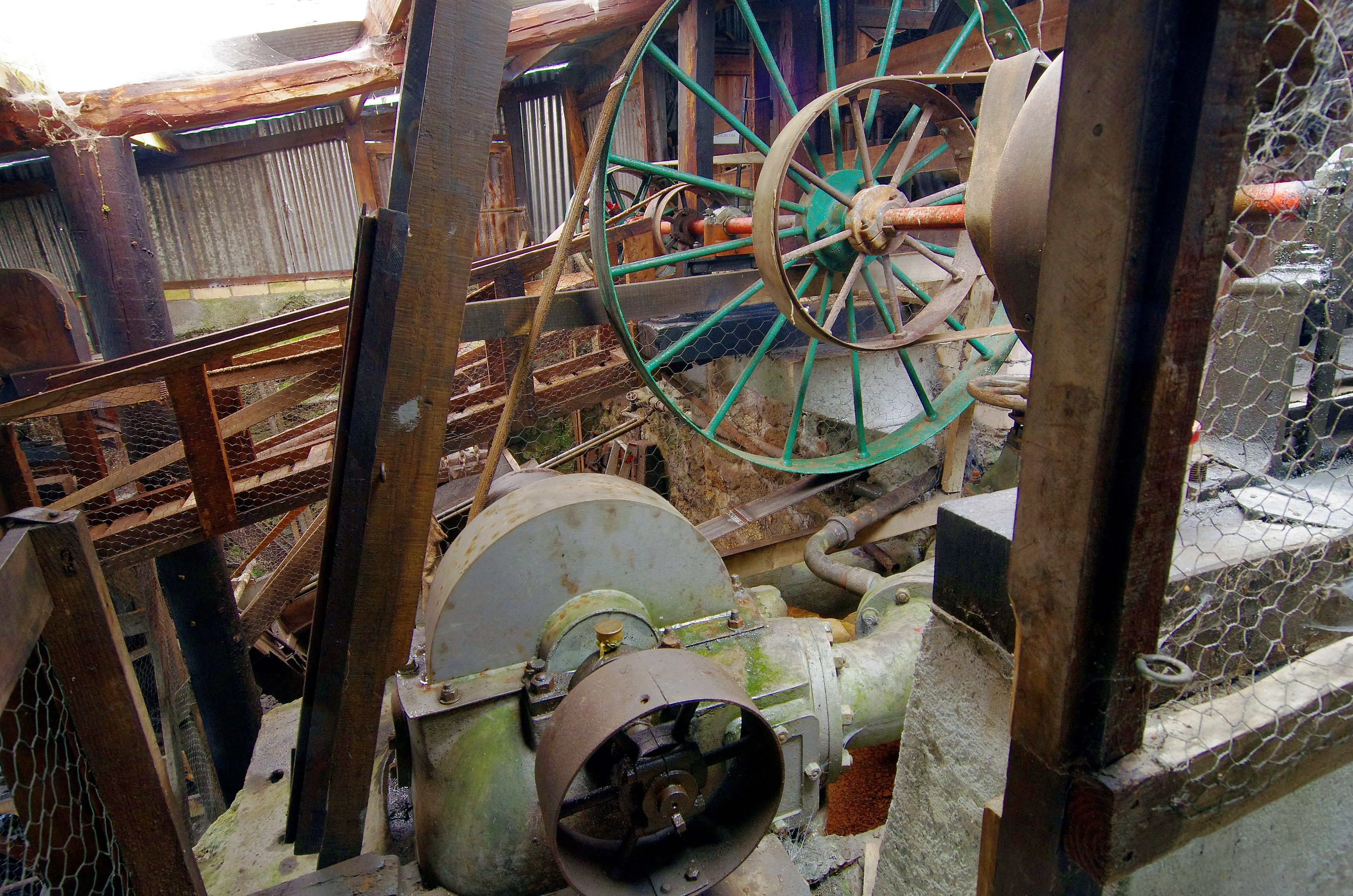 Californian stamps, powered from the Turgo wheel turbine. Probably the only stamps anywhere still regularly working as originally installed.