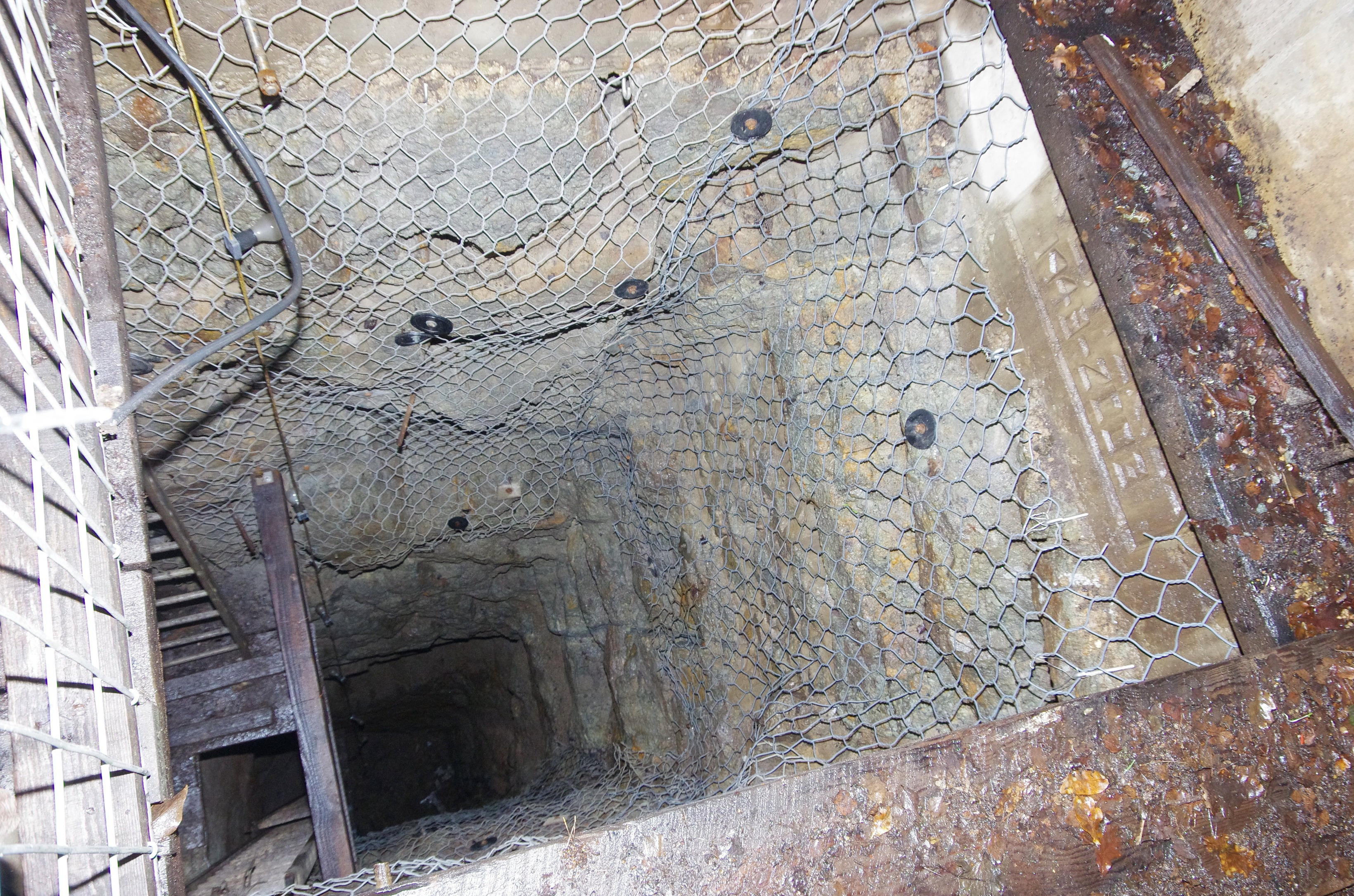 Looking down the shaft. It is about 80 ft deep, although there is several feet of debris and rubbish at the bottom, needing a long term effort if it is to be cleared. The shaft top became unstable and collapsed after shaft working was abandoned in about 1915, and a major programme of work was needed to stabilise it before the new headframe could be constructed. The shaft has been fitted with platforms and ladders, and with winch haulage to allow future work.