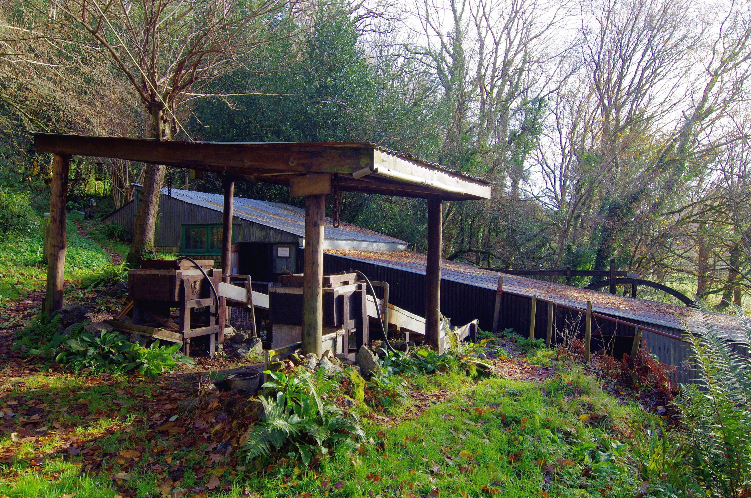 The ore chute from middle adit, with the tramway towards the mill. Careful excavation on the tip outside middle adit showed the path of the rails leading to the waste tip and to the head of the ore chute, followed by reconstruction of an ore chute in the original position. Ore can be trammed from the adit entrance and tipped down the chute, loaded into a truck, and pushed along to the washing strips and the mill.