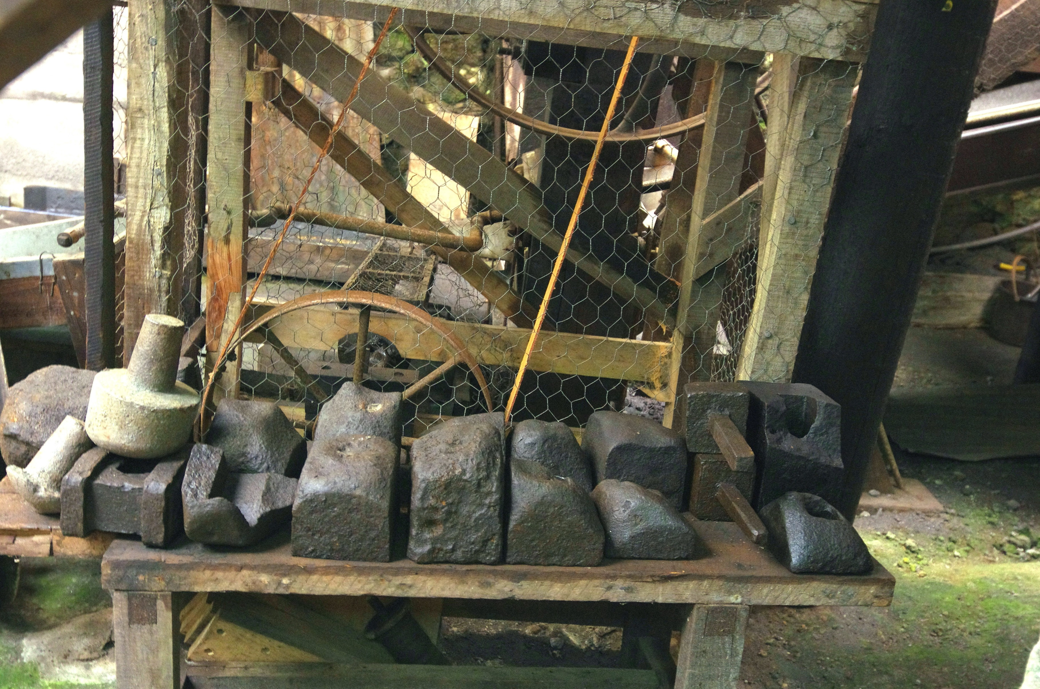 The demonstration set of Cornish stamps with the drive from the water wheel, and old Cornish stamp heads, compared to the used Californian stamp heads piled on the left. (Click/tap to enlarge)
