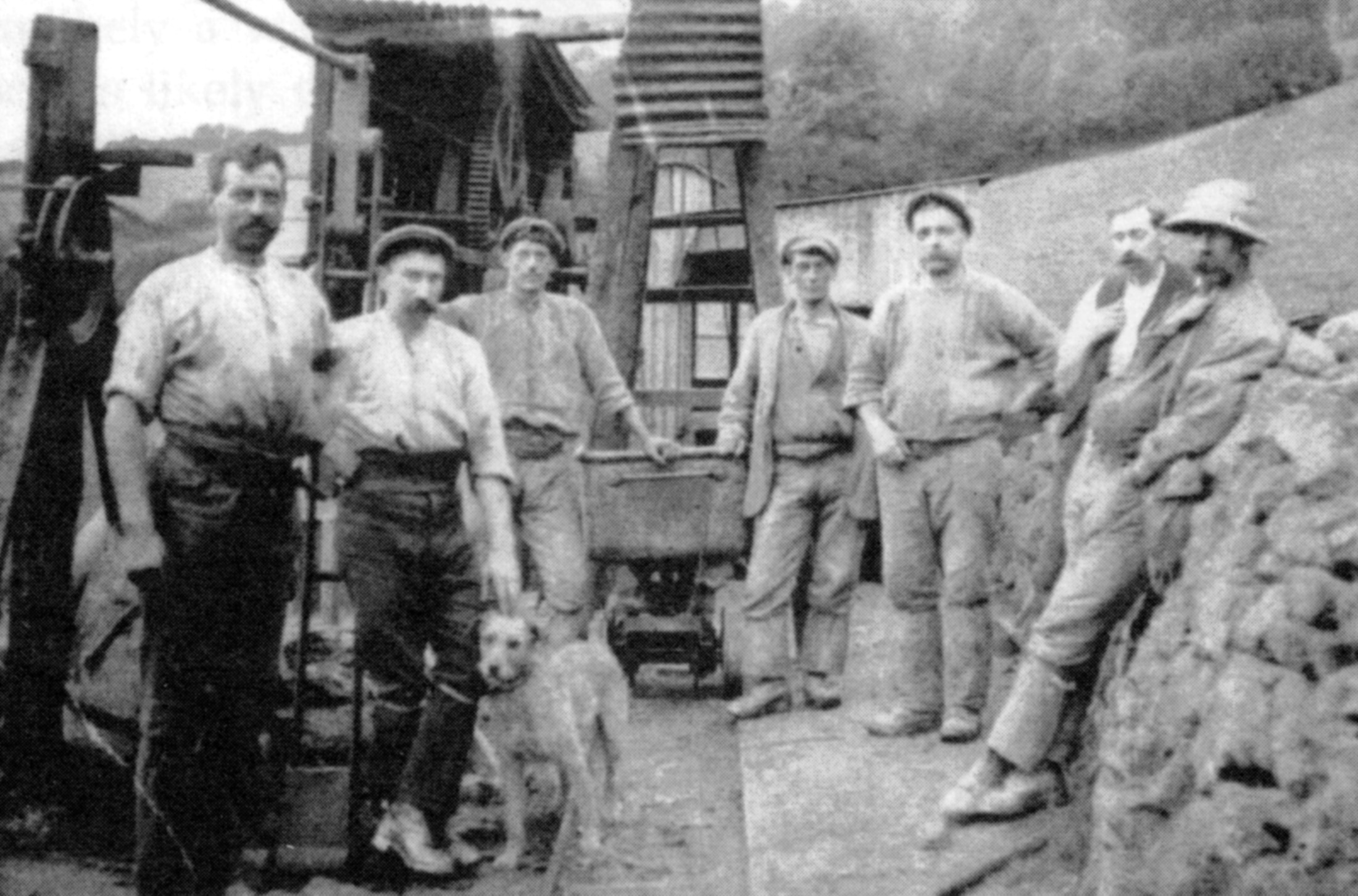 Up to 1900 the mine appears to have remained idle, until the Scottish Silvoid Company of Glasgow took over the lease with Mr. A.W. Govan as manager and Mr. Samuel Hill as mine captain. In 1901 thirteen men were working at Kelly, perhaps mainly doing development work as production in that year was only 20 tons. From then on output steadily increased, reaching a peak of 202 tons in 1907 in which year the photograph was taken of the Kelly miners standing in front of the shaft.