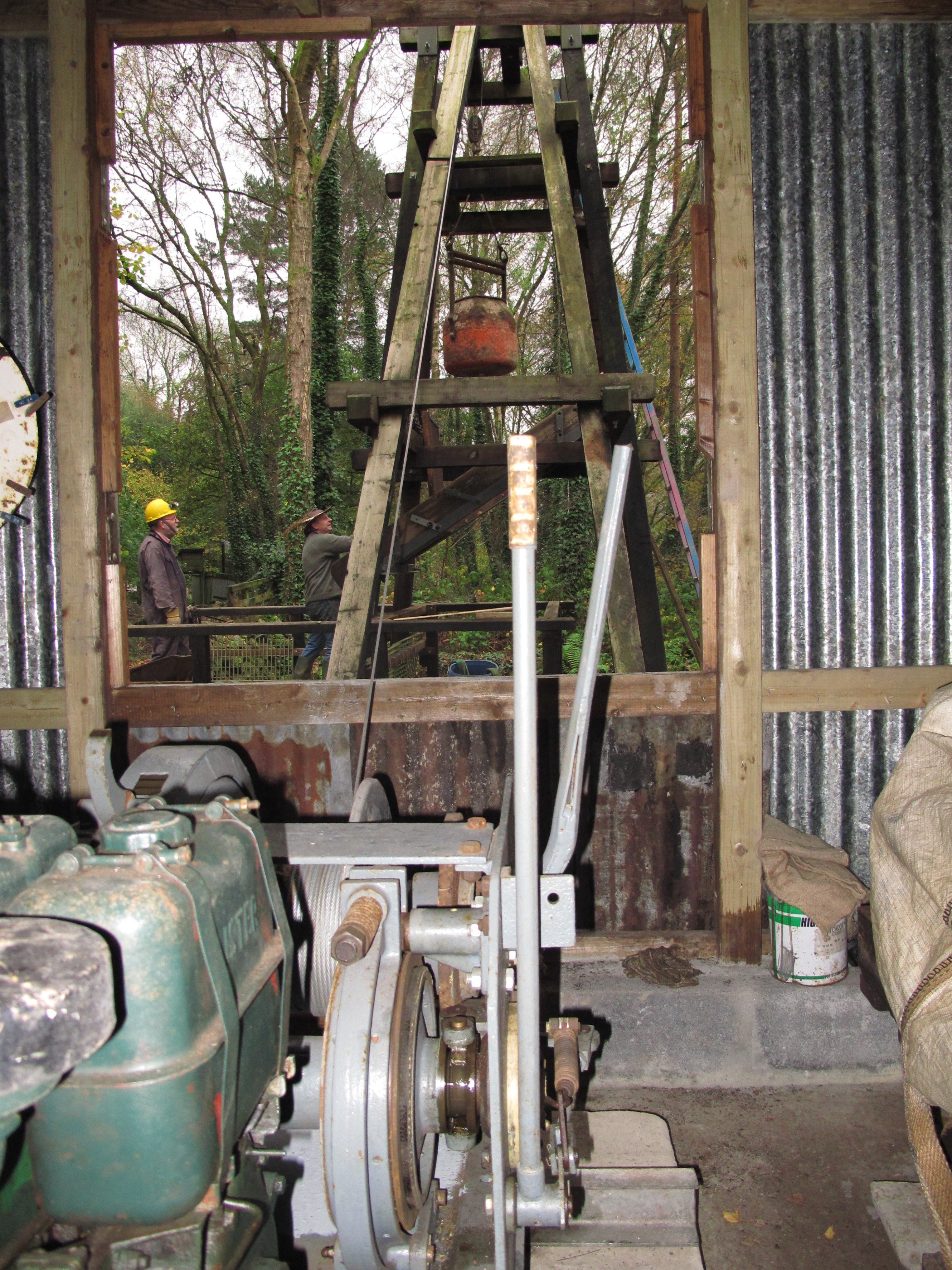 Looking down the shaft. It is about 80 ft deep, although there is several feet of debris and rubbish at the bottom, needing a long term effort if it is to be cleared. The shaft top became unstable and collapsed after shaft working was abandoned in about 1915, and a major programme of work was needed to stabilise it before the new headframe could be constructed. The shaft has been fitted with platforms and ladders, and with winch haulage to allow future work.