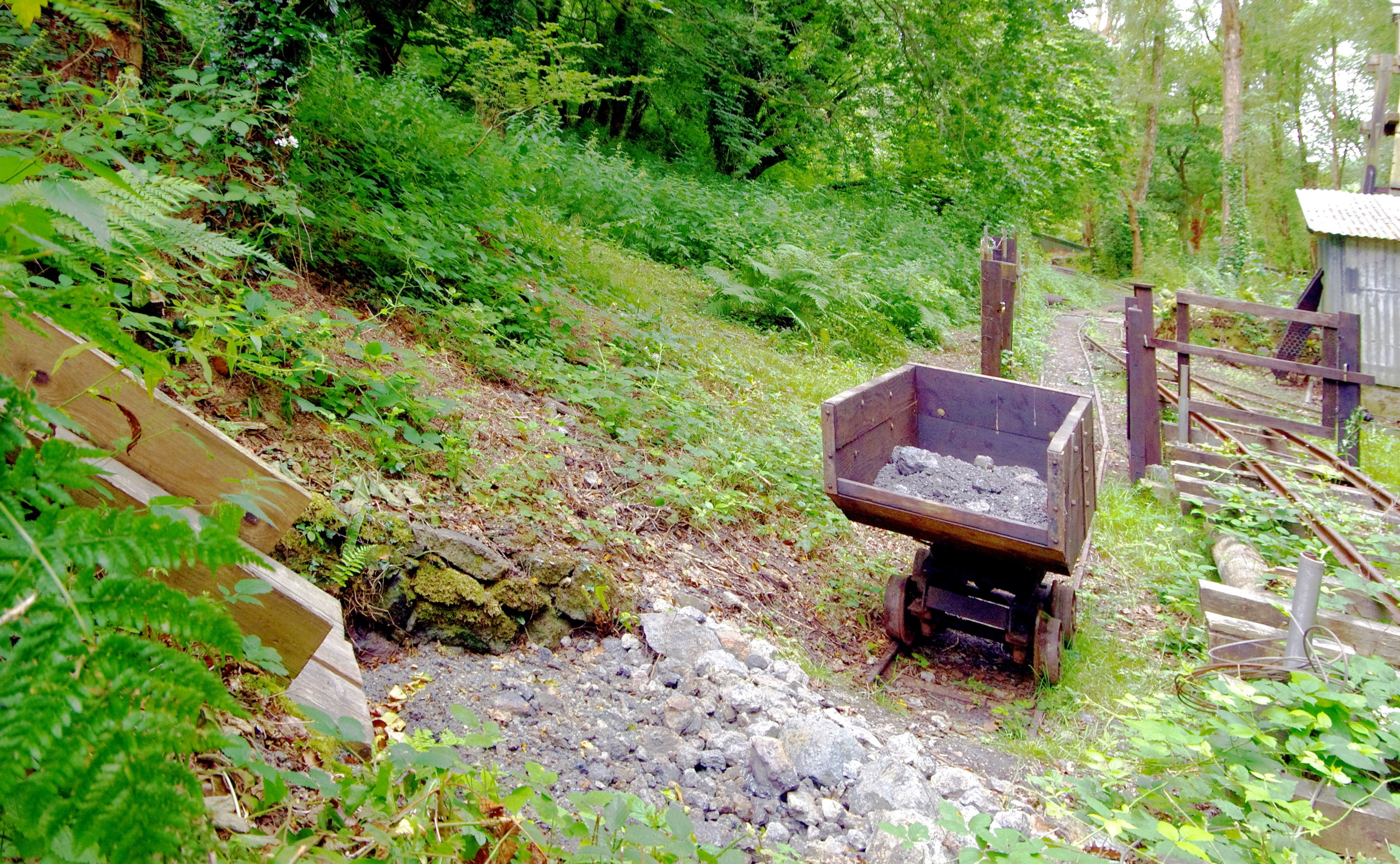 The ore chute from middle adit, with the tramway towards the mill. Careful excavation on the tip outside middle adit showed the path of the rails leading to the waste tip and to the head of the ore chute, followed by reconstruction of an ore chute in the original position. Ore can be trammed from the adit entrance and tipped down the chute, loaded into a truck, and pushed along to the washing strips and the mill.